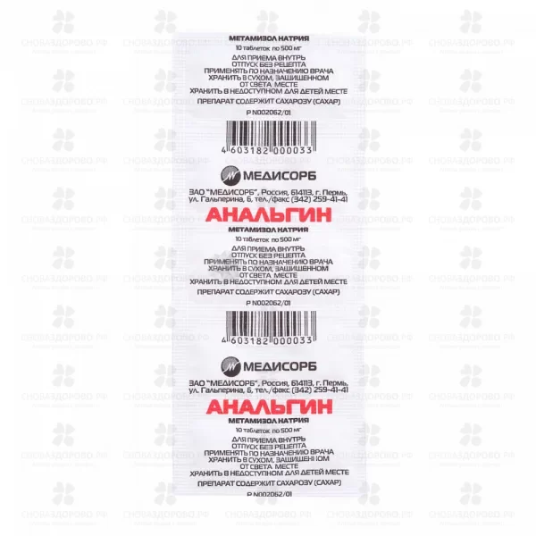 Действующее вещество: метамизола натрия моногидрат — 500 мг; вспомогательные вещества: крахмал картофельный, тальк, кальция стеарат.